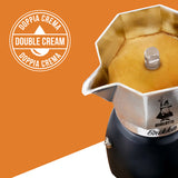 Kawiarka składa się z górnego zbiornika z uszczelką, filtra oraz dolnego zbiornika. Zmielone ziarna kawy umieszczamy w filtrze, nalewamy wody do dolnego zbiornika poniżej poziomu zaworu bezpieczeństwa i łączymy ze sobą wszystkie elementy. Stawiamy kawiarkę na kuchence i czekamy parę minut. Gorąca woda przemieści się do górnego zbiornika przepływając przez zmielone ziarna. Pyszne i aromatyczne espresso jest gotowe!
