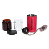 Każdy młynek zawiera dwa słoiczki na zmieloną kawę: jeden słoik z brązowego szkła oraz jeden z przezroczystego polimeru. Oba są łatwe do czyszczenia i mieszczą około 40g ziaren kawy. Młynek waży nieco ponad 600g - kompaktowy rozmiar i wytrzymała konstrukcja sprawiają, że to doskonałe narzędzie niezależnie od tego, czy jesteś w domu, czy w podróży.