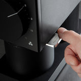 - Pojemnik na zmieloną kawę jest wykonany z aluminium. Na jego dnie jest magnes, który pozwala na łatwe umiejscowienie pojemnika na młynku. Zastosowano tu także rozwiązanie znane z profesjonalnych młynków - łopatka umieszczona przy zsypie pomaga pozbyć się resztek kawy z urządzenia, dzięki czemu retencja młynka jest wyjątkowo niska.