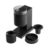 - Pojemnik na zmieloną kawę jest wykonany z tworzywa sztucznego. Na jego dnie jest magnes, który pozwala na łatwe umiejscowienie pojemnika na młynku, co pomaga uniknąć rozsypywania kawy podczas mielenia. Wyprofilowana pokrywka pozwala na wygodne przesypywanie zmielonej kawy w przypadku przelewowych metod parzenia, a dodatkowy adapter czyni pojemnik kompatybilnym z portafiltrami.