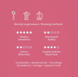 Kolumbia el Vergel to prawdziwa perełka w świecie bezkofeinowych kaw speciality. Słodka, z nutami smakowymi dojrzałych truskawek, orzeźwiających pomarańczy i egzotycznego posmaku marakui - wypalona pod espresso i dająca radość z każdego łyku o każdej porze dnia i nocy.