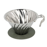 Hario V60-02 pozwala na zaparzenie kawy dla jednej lub kilku osób. Wersja metalowa zdecydowanie zachwyca swoim wyglądem - jest to idealne połączenie ekstrawaganckiego designu z funkcjonalnością. Charakteryzuje się on bardzo dobrym poziomem utrzymywania ciepła, oraz lekką i wytrzymałą konstrukcją. Stożkowa forma oraz specjalne żłobienia po wewnętrznej stronie drippera zapewniają doskonały przepływ wody. Dripper posiada silikonową podstawkę w celu lepszego dopasowania do naczynia, na którym jest stawiany. Użycie wytrzymałych materiałów czyni ten zaparzacz świetnym rozwiązaniem nie tylko w domu, lecz także podczas biwaku, czy w podróży.