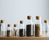 Bottlit Canister to przezroczysty pojemnik do przechowywania, o eleganckiej formie butelki i ponadczasowym designie, zwieńczonym korkowym zamknięciem.