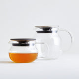 Dzbanek KINTO UNITEA One Touch Teapot jest wykonany ze szkła odpornego na wysokie temperatury, jego szeroka forma pozwala liściom herbaty swobodnie się rozwinąć, a przezroczyste ścianki pozwalają na obserwowanie procesu zaparzania. Profilowane ucho sprawia, że dzbanek wygodnie i pewnie leży w dłoni. Pokrywa z sitkiem z tworzywa sztucznego z uszczelką zatrzymują liście herbaty w dzbanku, dzięki czemu przygotowany napar jest pozbawiony fusów.