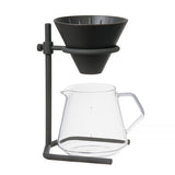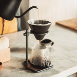 Stacja na dripper jest wykonana ze stali nierdzewnej i pozwala na parzenie kawy do naczyń o różnej wielkości. Wysokość, na jakiej ustawiony jest uchwyt jest regulowana.