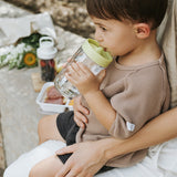 Ustnik butelki ma formę krótkiej, miękkiej słomki, dzięki czemu picie jest wygodne. Ustnik jest chroniony dodatkową zakrętką, która jest szczelna, więc nie musisz obawiać się o rozlanie napoju. Zakrętka z uszczelką są wykonane z tworzywa sztucznego i silikonu, które nie zawierają BPA. Uchwyt na nakrętce zapewnia dodatkową wygodę w przenoszeniu butelki. Zakrętkę można łatwo rozłożyć na części w celu czyszczenia. Wszystkie elementy można myć w zmywarce (na górnej półce).