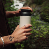 Ustnik kubka KINTO TRAVEL pozwala na picie z każdej strony i nie ma rowków, dzięki czemu picie jest przyjemne. Dodatkowy element pod ustnikiem sprawia, że po przechyleniu kubka napój nie wyleje się zbyt gwałtownie, a jeśli do napoju dodaliśmy kostki lodu, pozostaną one w środku. Zakrętka jest szczelna, więc nie musisz obawiać się o rozlanie napoju. Nakrętka z uszczelką są wykonane z tworzywa sztucznego i silikonu, które są bezpieczne w kontakcie z żywnością.