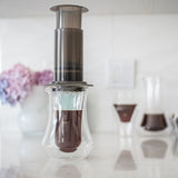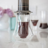 Karafka Pique to eleganckie naczynie do serwowania naparu. Podwójne ścianki utrzymują temperaturę napoju przy czym pozostają chłodne w dotyku. Pozwala to cieszyć się nam naszym ulubionym naparem przez dłuższy czas. Średnica jej górnej krawędzi ma 75 mm, tym samym pasuje do wielu najpopularniejszych urządzeń do zaparzania, takich jak na przykład AeroPress, czy dripper V60 od Hario.